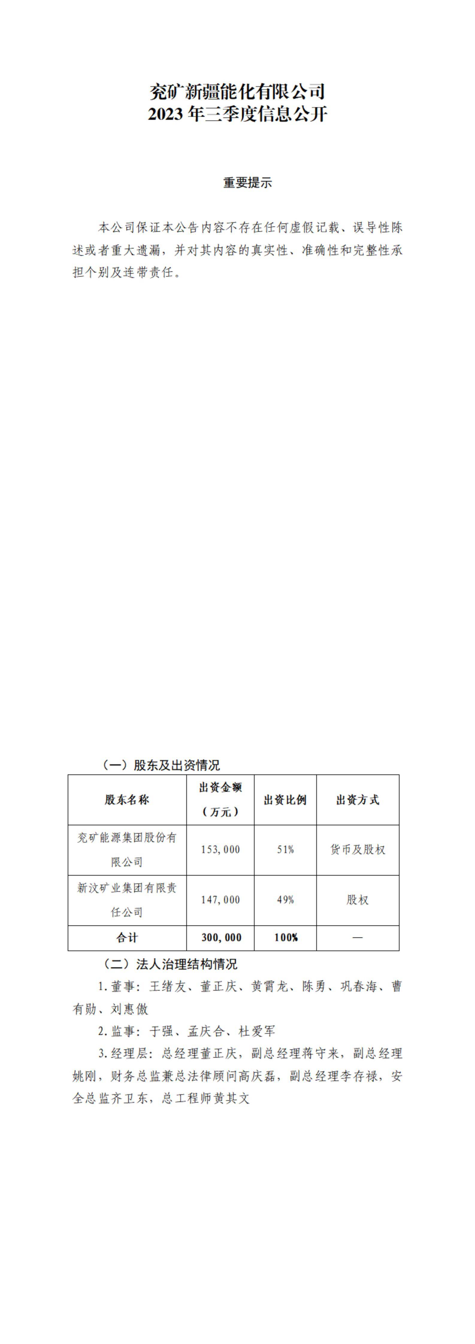 兖矿新疆能化有限公司2023年三季度信息公开-博天堂pa