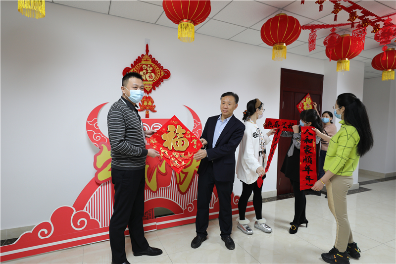 “送你一个‘福’字,祝你生活幸福”,除夕前夕,为了让留疆干部职工感受到过年的喜庆氛围,该公司提前采购了福字、窗花、春联、灯笼等物品,在职工宿舍、办公大楼张贴布置,公司领导面对面将“福”送到职工手中,寄托辞旧迎新、接福纳祥的美好愿望。生活的小细节和仪式感安定了留疆职工思乡念家的心。