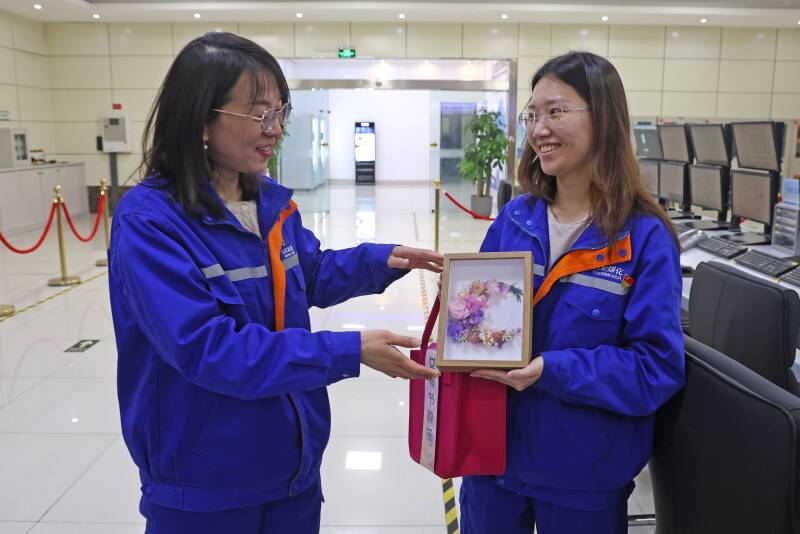 随后,慰问组带着特别定制的“芳华礼包”走进生产一线。在150中央控制室、301总变站,她们将装有护手霜、防晒伞和干发帽的暖心礼包,以及象征永恒祝福的永生花纪念品送到女职工手中。