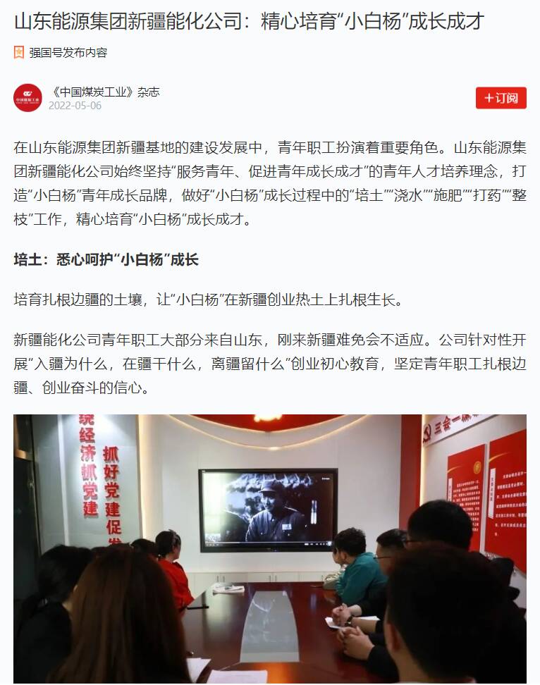 5月6日,《山东能源集团新疆能化公司:精心培育“小白杨”成长成才》,在“学习强国-中国煤炭工业杂志平台”刊载。