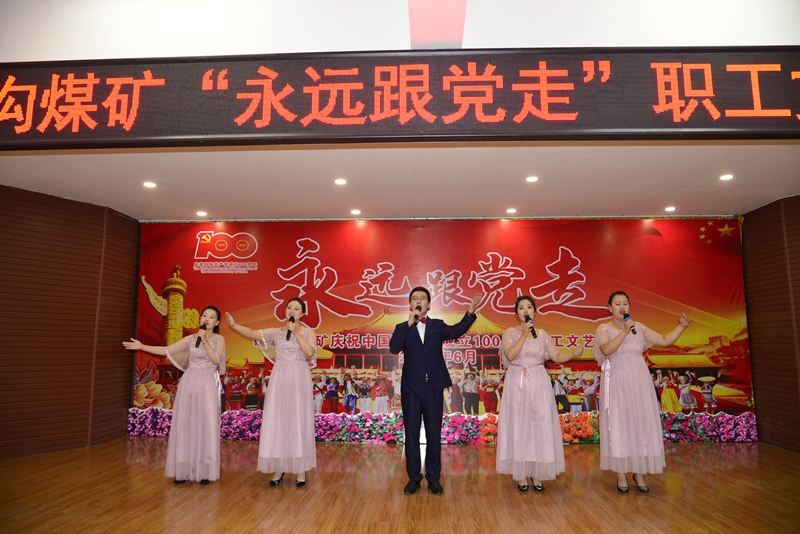 大会在慷慨激昂的国际歌声中开始,会上该矿党委表彰在过去一年中党的基层组织建设、党务工作和在党员先锋岗创建工作中涌现出的先进集体和先进个人,会上,该矿党委带领与会党员职工回顾我党100年来带领全国各民族人民为民族复兴、为人民幸福所走过的艰苦、卓越、伟大、光荣历程,回顾了为人民的解放事业、为共和国建设、发展,无数共产党人甘愿奉献青春与生命的光荣、伟大的共产主义精神。与会党员庄严的再次举起右手,面向党旗宣誓,重温入党誓词,大会在全体合唱没有共产党就没有新中国的歌声中闭幕。紧接着由该矿党员职工自排自演的主题为“永远跟党走”职工文艺演出拉开帷幕,演出节目既有具有民族特色歌颂老一辈革命家毛泽东的歌伴舞《毛主席恩情唱不完》,还有诗朗诵《七月的祝福》,该矿综采工区青年职工合唱的《咱们工人有力量》《没有共产党员就没有新中国》把该矿庆祝中国共产党成立100周年文艺演出推向了高潮,《大中国》《走进新时代》《明天会更好》等歌曲大演唱,唱出了该矿青年党员职工感党恩、颂党情的真挚情怀,也唱出他们永远跟党走的坚定政治信念。