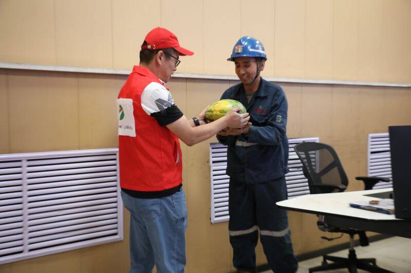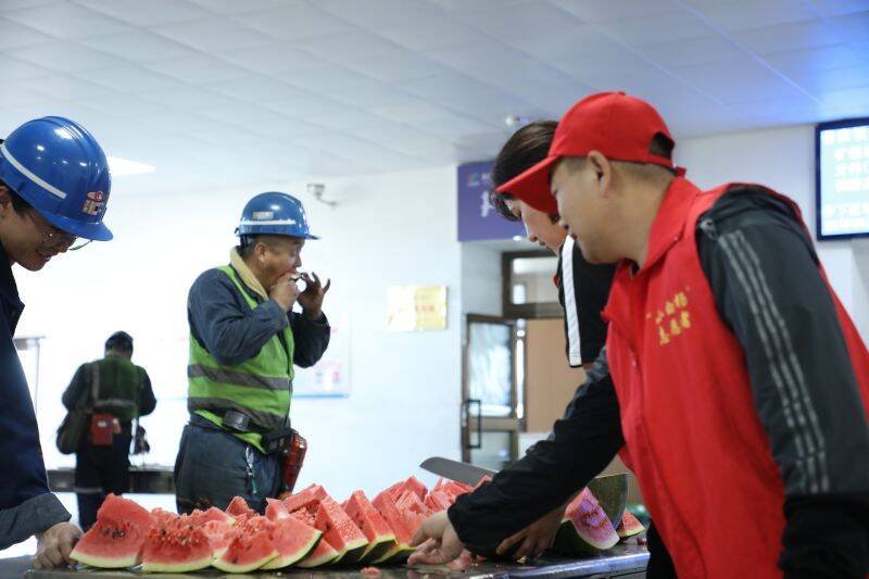 “师傅你们辛苦了!来吃块西瓜吧!”在新疆能化伊犁一矿井口,青年志愿者们正在为职工发放解暑西瓜。