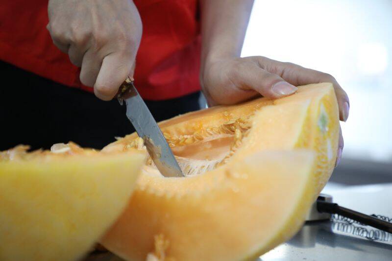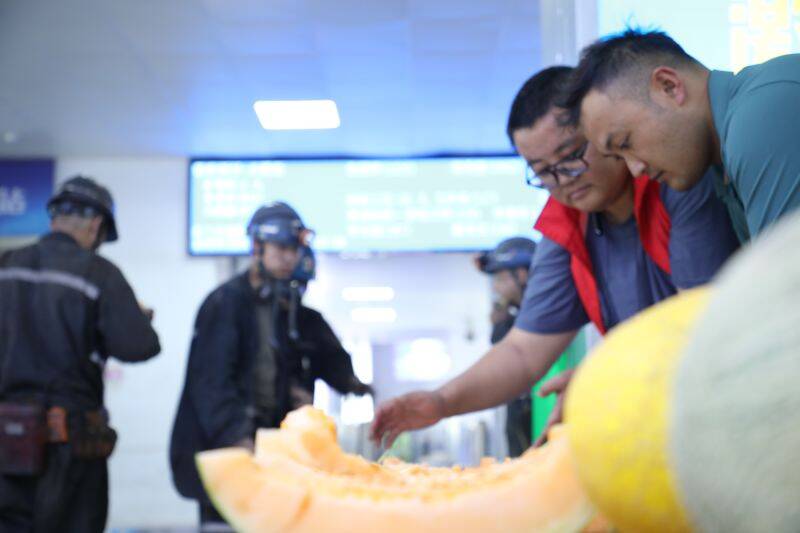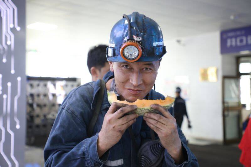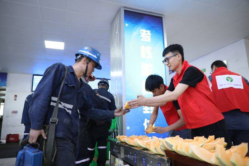 “今天吃甜瓜师傅,管够!”在该矿井口,志愿者们不时招呼,引来不少“吃瓜群众”。志愿者口中的甜瓜指的是新疆特产“哈密瓜”,只见志愿者一刀下去,肥美的果肉伴随着丰富的汁液一一爆开,令人垂涎欲滴。过往职工纷纷被吸引,来到桌边大快朵颐。