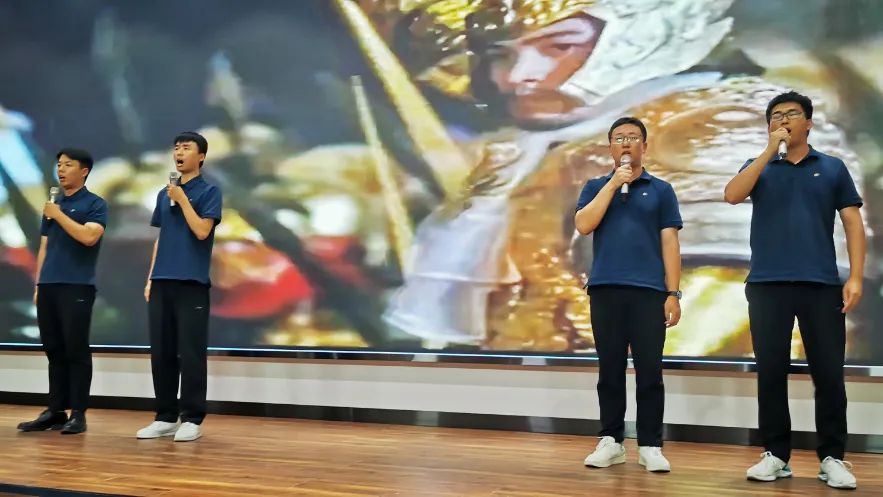 ▲新员工刘阳、孙煜林、张宗梁、梁哲源 歌曲《精忠报国》