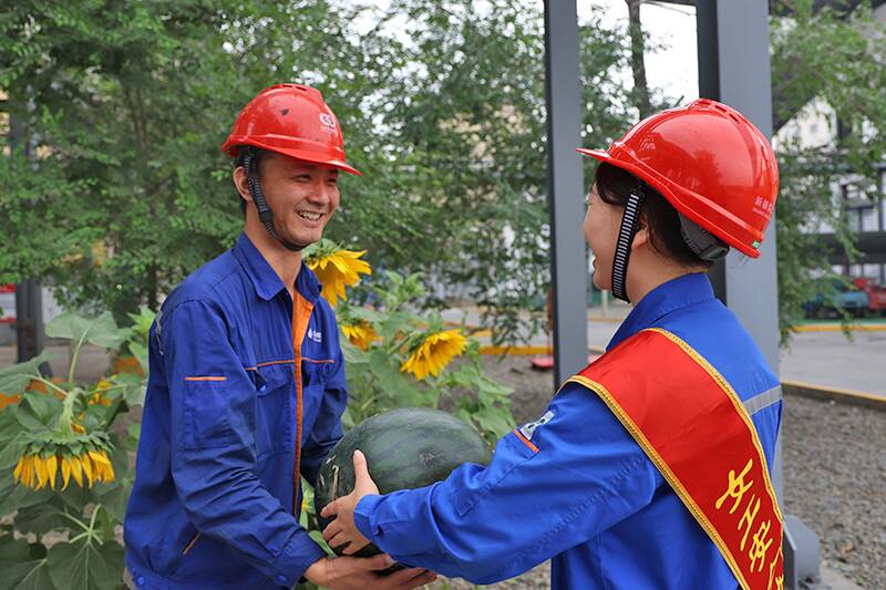 “师傅们,天热多吃点西瓜!记得每两小时补次水,别中暑!”新疆煤化工女工协管员组成的“夏日清凉服务小分队”,带着切好的西瓜穿梭在生产现场,用夏日的清凉关怀撑起一片安全绿荫。