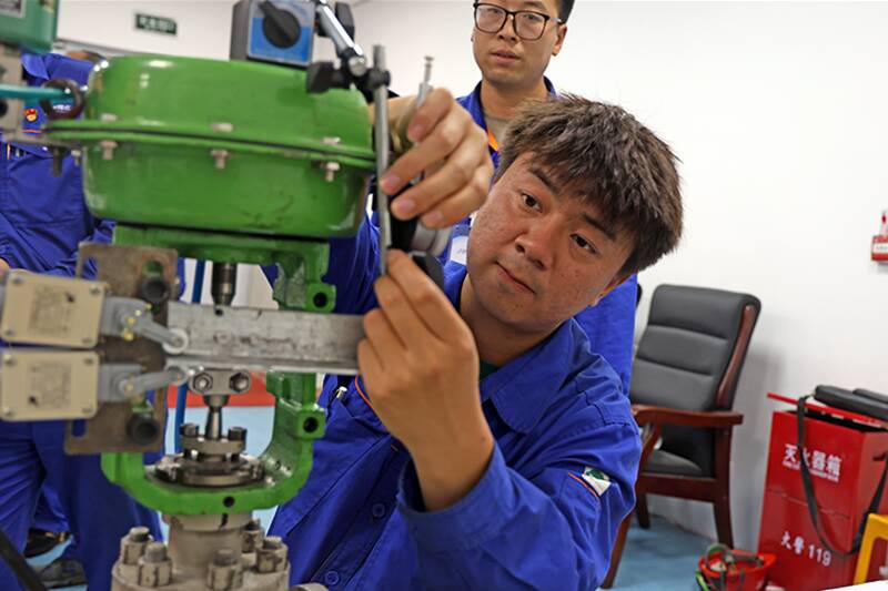 化工仪表维修工的赛场“技术感”拉满。面对复杂的仪表设备,选手们迅速识别故障点,熟练使用工具调校阀门参数,快速定位问题并完成修复。