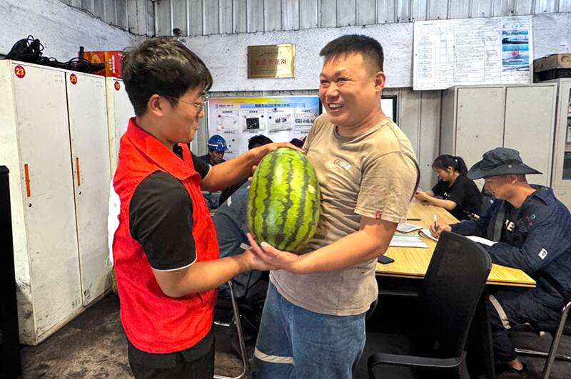 7月以来,该公司工会全面铺开“送清凉、保安全”活动,组织“小白杨”青年志愿者为一线职工们送去甘甜解暑的西瓜和冰爽绿茶,更将殷切的安全叮嘱与健康关怀一并送达。