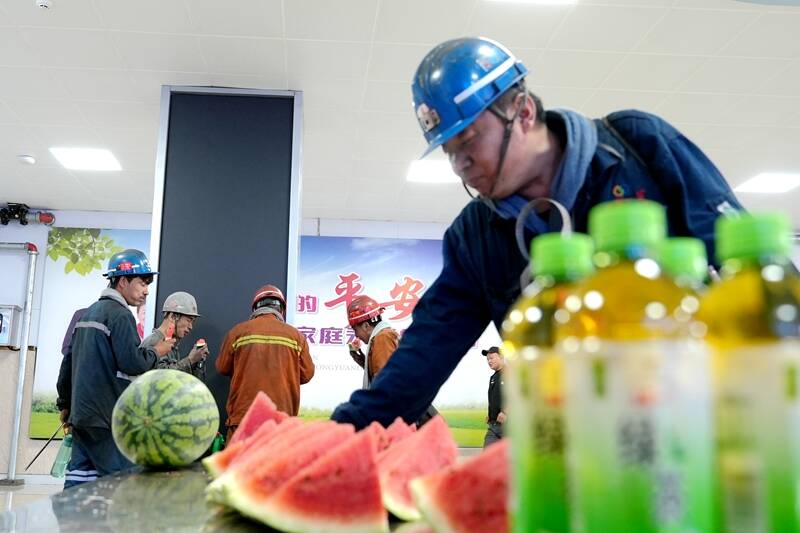 7月17日,刚结束井下作业的职工升井,迎接他们的不仅是切好的甘甜西瓜,还有志愿者关切的叮嘱:“师傅辛苦了!多补充水分,注意安全!”冰凉的绿茶递到手中,瞬间驱散疲惫。