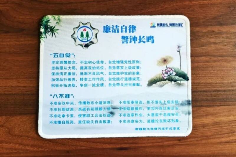 “坚定理想信念,不忘初心使命,自觉增强党性原则……”廉政鼠标垫上印有“五自觉”“八不准”标语提醒职工常怀律己之心、常思贪欲之害,严于律己、廉洁从业,时刻保持共产党员的先进性、纯洁性。通俗易懂的警示语,融入新疆能化“天山云杉”廉洁文化标识,并配以莲、竹等图案,引导党员树牢廉洁从业理念,营造“全员廉洁”的良好工作氛围。