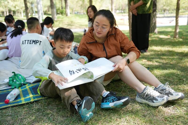 “逛三园,什么园?蔬果园!水果园!动物园!”在“农博漫游”知识竞答环节,家长和孩子组队穿梭“蔬果园”“动物园”,在你问我答间解锁植物知识,赢家手中的小礼品成了最甜的“协作勋章”。《一园青菜成了精》《彩虹色的花》《落叶跳舞》……20 本自然绘本铺满草坪。自然绘本的共读时光,更让书香与青草香交织,家长们低头轻声讲解,孩子们仰头认真倾听,书页翻动声与鸟鸣虫吟谱成最动人的“家庭协奏曲”。
