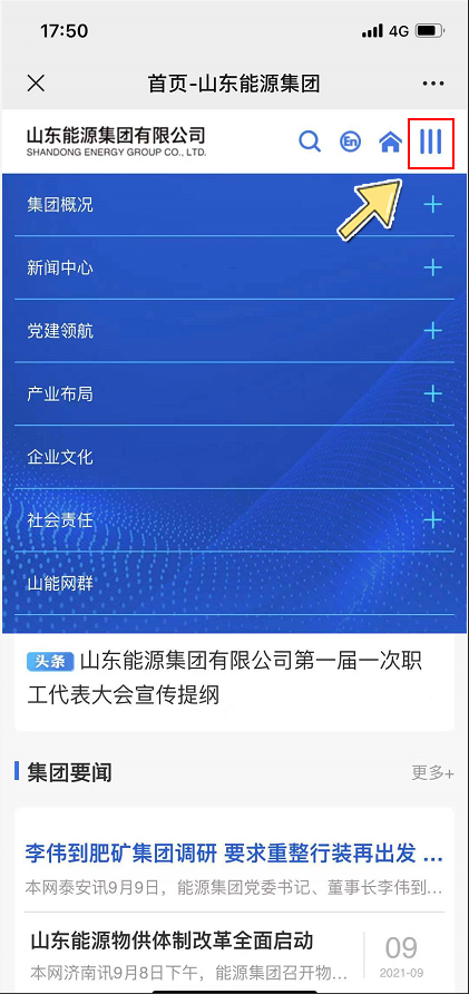 在手机端打开http://www.shandong-energy.com访问。点击右上角菜单符号可弹出下拉菜单,选择栏目浏览。
