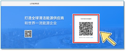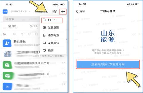 (2)进入钉钉扫码界面。打开手机钉钉app,右上角“ ”“扫一扫”,扫码后点击“登录网页版山东能源内网”,既可进入内网浏览。