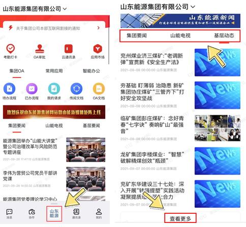 打开手机钉钉客户端,点击下方“山东能源”即可浏览集团要闻、山能电视、基层动态,点击“查看更多”可访问更多内部资讯。